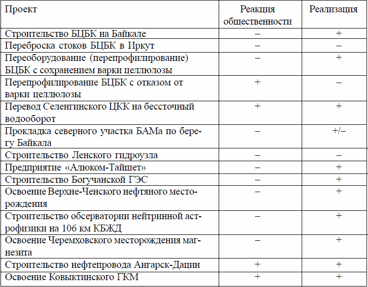 Для того чтобы проиллюстрировать, насколько общественное мнение влияет на реализацию или отклонение проектов, составлена таблица 36, в которой отражена реакция общественности: (-) – отрицательная, (+) – положительная или конструктивное обсуждение, а также и окончательное решение по реализации проектов: (-) – отклонен, (+) – реализован или принят к реализации.