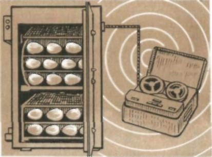 Обычно в один инкубатор закладывают 8—10 тысяч яиц. Цыплята должны появиться через 21 день. Однако, когда яиц так много и снесены они не в одно время, период вылупления длится около трех суток. В «озвученном» инкубаторе срок сокращается до суток, т. е. в месяц экономится два дня, а в пересчете на год получается, что в каждом инкубаторе можно вывести лишнюю партию птенцов. Учитывая, что в среднем хозяйстве имеется три-четыре инкубатора, чистый доход составляет 0,5 миллиона рублей в год. А если магнитофоны появятся на всех птицефабриках страны?