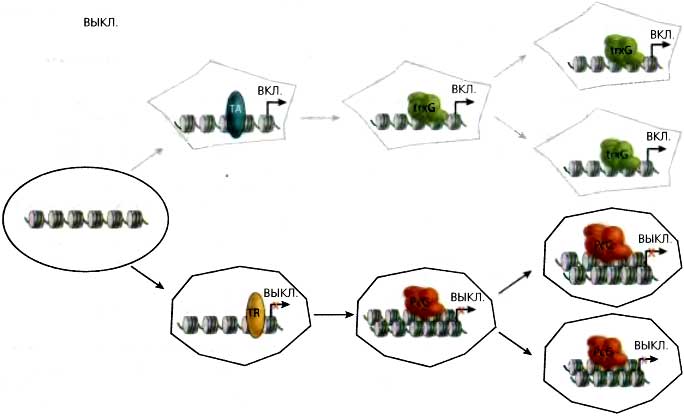 Схема, иллюстрирующая участие комплексов PcG и trxG в детерминации активного и репрессированного состояний экспрессии генов и, тем самым, клеточной дифференцировки, которая поддерживается на протяжении многих клеточных делений: (ТА) транскрипционный активатор; (TR) транскрипционный репрессор