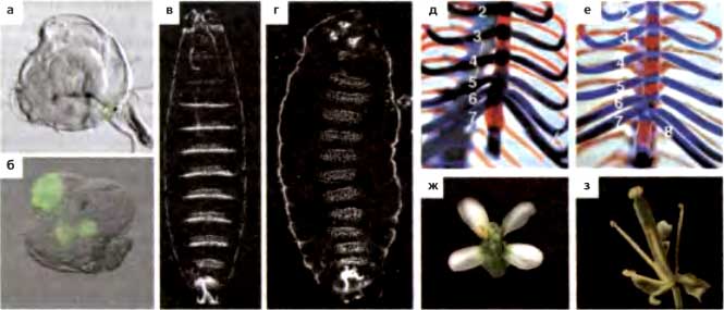 (а-г) Drosophila melanogaster, (д, е) Mus musculus, (ж, з) Arabidopsis thaliana. (а, б) Ножные имагинальные диски, претерпевающие трансдетерминацию, на что указывает экспрессия крыло-специфического гена vestigial (маркированного GFP). (в. г) Кутикулы эмбриона дикого типа (в) и мутанта Su(z)12 (г). У мутантного эмбриона Su(z)12 все абдоминальные, торакальные и несколько головных сегментов (не все из них видны в этой фокальной плоскости) гомеотически трансформированы в копии восьмого абдоминального сегмента благодаря нарушенной экспрессии гена Abd-B в каждом сегменте, (д, е) Осевой скелет новорожденных мышей дикого типа (д) и RinglA-/- (е) Вид торакальных районов очищенных скелетов, показывающий кости (красный цвет) и хрящ (синий цвет). Мутант обнаруживает переднюю трансформацию восьмых торакальных позвонков, на что указывает наличие восьми (1—8) вертебростернальных ребер вместо семи (1—7), как у дикого типа, (ж, з) Цветок дикого типа (ж) и мутанта clf-2 (з). Цветок дикого типа демонстрирует нормальное расположение чашелистиков, лепестков, тычинок и плодолистиков. У цветка clf-2 лепестки отсутствуют или число их уменьшено. (а.б, с любезно предоставлено N. Lee and R. Раго; в, г, перепечатка, с любезного разрешения, из Birve et al., 2001 [©Company of Biologists Ltd.]; д, e, перепечатка, с любезного разрешения, из del Маг Lorente et al., 2000 [©Company of Biologists Ltd.]; з, любезно предоставлено J. Goodrich)