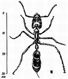 Рис. 16. Рядом изображены самый большой в мире муравей и самый маленький: гигантский муравей Diponera и крошка Pheidole (справа). Оба из одной местности на севере Аргентины (по Гетчу).