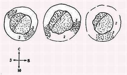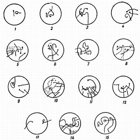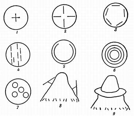 1 — маленькая крестовина с короткими концами; 2 — крестовина, в которой центр оставлен свободным; 3 — пластинки, расположенные тангенциально; 4 — параллельно расположенные пластинки; 5 — кольцо с «дверцей»; 6 — концентрические кольца; 7 — полые цилиндры, поставленные рядом на купол; 8 —пластинки, образующие острый угол с поверхностью купола; 9 — дисковидное кольцо, опоясывающее купол (по Шовену)