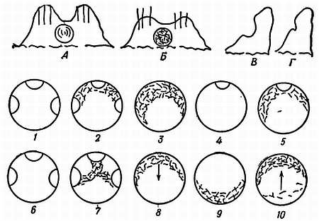 А и Б — выравнивание ямки и сглаживание двух вершинок (палочки, врытые по три в каждую вершинку, после совместных усилий муравьев выступают уже наполовину) (Б), В и Г — заделывание ямки, начинающееся снизу (в разрезе). Далее приведены в виде схемы различные типы переделок купола: 1, 2 и 3 — три фазы заравнивания с помощью веточек трех возвышений, находящихся по краям муравейника, 4 и 5 — такая же операция с одним возвышением; 6 и 7 — необычный способ соединения трех возвышений через центр; скопление веточек в форме полумесяца было перенесено в направлении, указанном стрелкой, в положение, показанное на 9; 10 — постройка скопления на прежнем месте (его полулунная форма при этом в общих чертах восстанавливается) и уничтожение перемещенного (по Шовену).