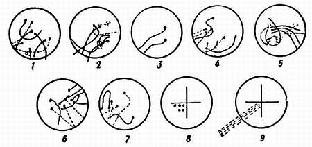 Крест из жирных линий показывает расположение стран света, крест из тонких линий — расположение перегородок на верхушке купола. Маленькими крестиками обозначены различия в активности муравьев, неодинаковой в равных секторах. Дуги, связывающие планки креста, показывают степень строительной активности, чем она выше на участке между двумя участками, тем больше на чертеже дуговых линий. Окружность или полукруг отражает степень затененности муравейника; многие муравейники затенены со всех сторон… На схеме 4, 7 и 8 изображены также дуги со стрелками на концах; ими обозначено быстрой обходное движений муравьев, иногда наблюдающееся после установки перегородок на куполе (по Шовену).