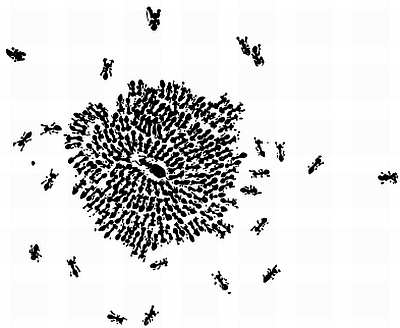Как расценивать теорию стигмергии? Сейчас это, может быть, и затруднительно, так как мы не располагаем еще достаточными данными. Думаю, что при всех условиях следует принять предложенную Грассе схему первых фаз строительства. Эта схема подсказывает некоторые эксперименты: например, можно в «фазе несогласованной работы» произвольно определять зону будущего строительства, прилепляя в намеченном месте друг на друга три-четыре земляных шарика.
