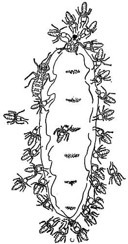 Численность гнезд термитов достигает невероятных размеров в тех районах, где климат дли них благоприятен. Грассе пишет, что в Экваториальной Африке почти невозможно копнуть землю лопатой, не потревожив при этом гнезда термитов. То, что они непрерывно ворошат почву и подпочву, несомненно, оказывает влияние на образование перегноя. Невероятная многочисленность термитов объясняется колоссальной плодовитостью царицы. У некоторых видов, например у представителей рода Bellicositermes, она бывает толщиной с сосиску, тогда как рабочие и работницы (Нуарó недавно показал[22], что в этой касте встречаются термиты обоих полов) — величиной с нашего муравья. Царица откладывает сотни яиц в минуту. В своей сводчатой палате в самом центре термитника она окружена толпой слуг — одни облизывают ее, иногда даже кусают и с жадностью пьют ее кровь, другие движутся по кругу в одном и том же направлении (рис. 31). Все участники этой странной карусели заняты делом: подносят корм, уносят яйца, откладываемые со скоростью пулеметной очереди. А в это время самец (не такой крупный, как царица, но огромный по сравнению с термитами-рабочими) почти не двигается. В отличие от самцов других общественных насекомых он не погибает сразу после спаривания, а продолжает жить в царской палате и время от времени оплодотворяет царицу.