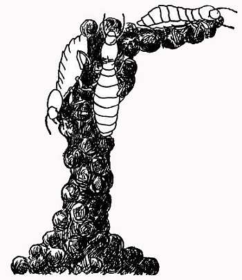 Все воскресенье я провел у кофейного дерева, и был буквально загипнотизирован. Действуя пинцетом, я раздвигал два листа — из гнезда выбегала разъяренная стража. Но я уже научился вовремя прятать пальцы. Очень скоро за работу принимаются «тягачи» — это цепочки муравьев, которые, взбираясь один на другого, сближают разведенные мной края листьев. Одна, две, три цепи становятся на свои места, и вот благодаря общим усилиям края листьев соединяются. В это время между ними снует один муравей, сжимая в челюстях личинку того же вида CEcophylla. Он прикладывает личинку к краям обоих листьев, работая ею, как челноком, а личинка при каждом прикосновении к листу выпускает шелковую нить; в конечном счете образуется настоящая ткань (рис. 25). Тогда тягачи удаляются, ибо нити, выделяемые личинками (взрослые муравьи утратили эту способность), очень прочны и листья теперь не разойдутся.