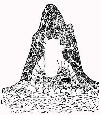 Но в естественных науках приходится сталкиваться с ограниченностью почти любой теории. Сначала, как я уже говорил, кажется, что она полностью подтверждается. Между тем теория Грассе может объяснить только строение гнезд, имеющих губчатую структуру. Однако такой структурой гнездо термитов обладает лишь в отдельных своих частях, и сам Грассе, долго изучавший в Африке термитов, описал очень сложно устроенное гнездо Bellicositermes (рис. 33) с огромными странными столбами у основания; можно подумать, что они обточены на станке.