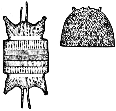 Оказывается, каждый такой панцирь состоит всегда из двух маленьких половинок-створочек: одна из них едва крупнее другой и надета на нее своим свободным краем, как крышка на коробку. Свободные края двух створок панциря только слегка, узкой полоской заходят друг за друга, и эту полоску, где створка заходит за створку, называют пояском. Вот почему такую кремнеземку всегда можно рассматривать в различных видах: или со створки, или, повернув ее на 90°, — с пояска.