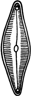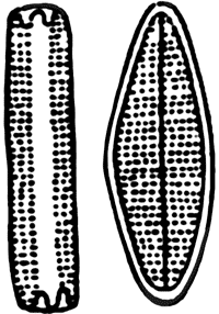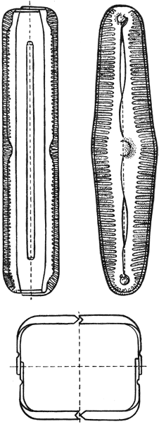 Таким образом, оболочка диатомей не только крепкий панцирь, но это еще микроскопическая изящная коробочка с маленькой, плотно пригнанной крышечкой, то круглая или продолговатая, то трехугольная, то в виде прямоугольника, то в виде лодочки, то как тончайшая палочка и т. д.