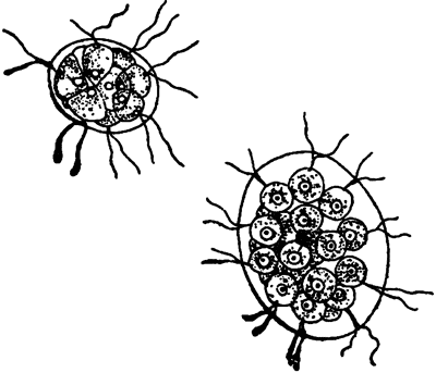 Рис. 35. Колониальные водоросли: внизу — эудорина, вверху — пандорина (сильно увеличено).