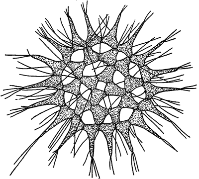 Но у астерионелли есть еще замечательное приспособление: когда колония жива, то между ее лучами как бы натянуты тончайшие слизистые нити, отчего вся колония в целом делается похожей на маленький зонтик или парашют. Да это и действительно самый настоящий парашют, который медленно переносится токами воды, не тонет в воде, а по-настоящему «парит» в ней.