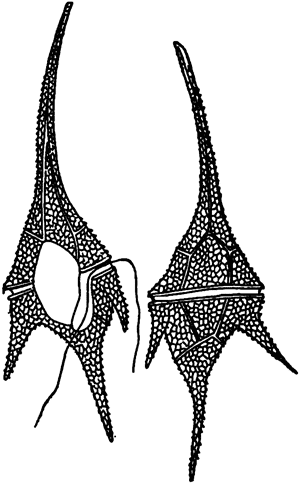 Упомянем еще о бурых и голубых обитателях планктона. Очень редко попадается церациум из перидиновых водорослей[28] — несомненно, одно из оригинальнейших планктонных растеньиц. По окраске он напоминает диатомей, а по форме своей и по структуре оболочки это не менее удивительный организм, чем кремнеземки.