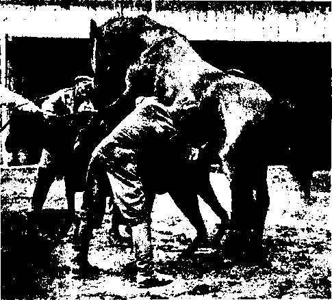 Чучельный метод. ЛИО разработан метод садки самца млекопитающих на чучело. После приучения самца (жеребец, бык, хряк, баран) к ручной садке на самку можно без особого труда посадить его на чучело (рис. 28). Чучело устраивается из прочного каркаса, обтянутого мягким и обернутого шкурой или еще лучше — сукном, так как сухая шкура издает барабанный звук, пугающий самцов при садке. Сходство чучела с самкой может быть весьма относительное. Как упоминалось, жеребец идет и на чучело коровы. В опытах Веревкиной и Скаткина «быки симменталы с первого же раза охотно пошли на чучело несмотря на то, что оно было еще не доделано: сзади ниже вымени торчала деревянная основа, голова не была зашита, из-под кожи торчали стружки, кроме того кожа после выделки имела специфический запах квашения».