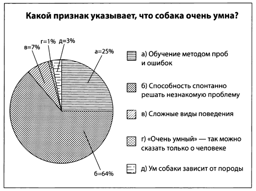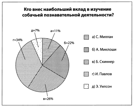 Большинство опрошенных (60 %) считают, что основную массу имеющихся знаний о собачьей познавательной деятельности мы приобрели благодаря Скиннеру или Павлову. Лично я считаю, что наибольший вклад в изучение этой проблемы внес Адам Миклоши из Университета Лоранда Этвёша, Будапешт, Венгрия.