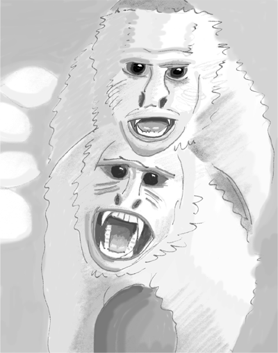 Два белоплечих капуцина принимают позицию «повелитель», так что их противник одновременно сталкивается с двумя угрожающими лицами с двойным набором зубов