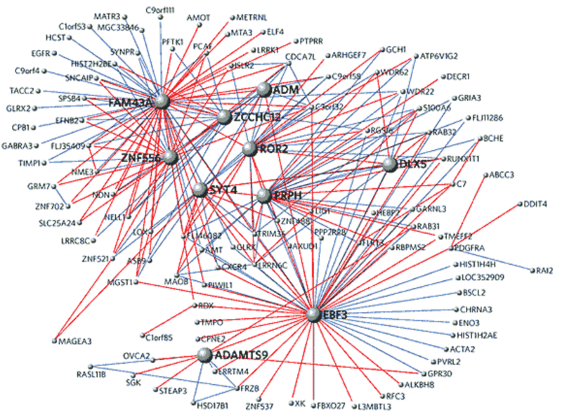 Рисунок 56. Комплекс связанных генов, так или иначе взаимодействующих с геном FOXP2, одним из генов, ответственных за формирование речи у человека (Konopka et al., 2009).