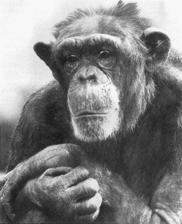 Самая старая наша шимпанзе – это самка, которой, по нашим оценкам, около сорока лет. (Максимальный зафиксированный возраст шимпанзе в неволе – пятьдесят девять лет. В дикой природе они, вероятно, никогда не живут так долго.) Мы называем ее Мамой. Ее взгляд излучает огромную силу. Она смотрит на нас оценивающими и всепонимающими глазами старой женщины.