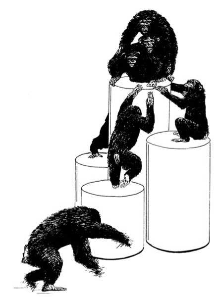 Стояла зима, а потому обезьяны жили в большом закрытом помещении. Каждое утро сначала выпускали трех новых самцов. Один из них, Йерун, сразу бежал, вздыбив шерсть и ухая, к большим барабанам. За ним вплотную бежали два других – оба кричали и постоянно боязливо озирались. Три самца становились рядом друг с другом и пристально следили за коридором, из которого должны были появиться самки. Затем самцы вставали, сгрудившись, на самый высокий барабан, а самки бросались на них снизу. Все это происходило по команде Мамы и ее подруги Гориллы. Они кусали самцов за ноги и тянули их за волосы. Жертвы защищали себя как могли, но это лишь усиливало агрессивные выпады самок. То, что взбешенные самки внушали им страх, легко было опознать по сильным крикам, диарее и рвоте.