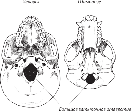 Наша голова покоится на верхнем конце шейного отдела позвоночника. Шейные позвонки шимпанзе сочленяются с черепом ближе к его заднему концу, нежели шейные позвонки человека. Если вы посмотрите на основание черепа шимпанзе и сравните его с черепом человека, то увидите, что они отличаются друг от друга по расположению большого затылочного отверстия – отверстия, где продолговатый мозг переходит в спинной мозг. Так вот, у шимпанзе большое затылочное отверстие находится ближе к задней оконечности черепа, чем у человека. По обе стороны от большого затылочного отверстия (у обоих видов) располагаются два овальных выступа, называемые затылочными мыщелками. Эти выступы представляют собой поверхности, сочленяющиеся с суставными поверхностями первого шейного позвонка.