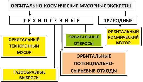 В общем случае в понятие «Орбитально-космические мусорные экскреты» включены следующие объекты (смотри приведённую ниже Схему):