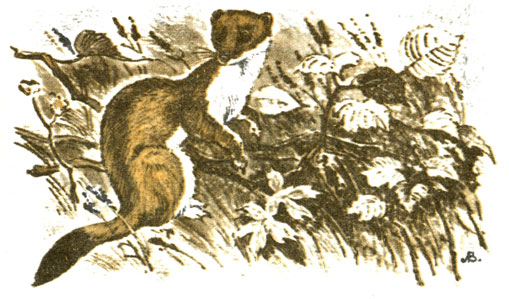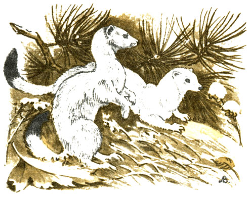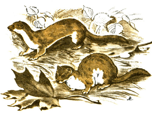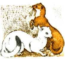 И окрашены горностай и ласка сходно: летом у них спинки коричневые с различными оттенками, а животики белые, причем граница резкая, без переходов. Осенью, к выпадению снега, они, вылиняв, становятся чисто-белыми. Только у горностая кончик хвоста черный.