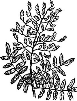 Когда заканчивается цветение, на месте цветочной метелки образуются связки длинных мясистых бобов с перехватами, наполненных желтовато-зеленым клейким соком с семенами, похожими на чечевицу. Плоды начинают созревать в сентябре и держатся на дереве всю зиму.
