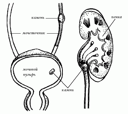Мочекаменная болезнь – это заболевание, сопровождаемое образованием в почечных канальцах, почечной лоханке и мочевом пузыре или застреванием в просвете мочеточника, уретре мочевых камней – уролитов – в процессе уролитиаза (рис. 55).