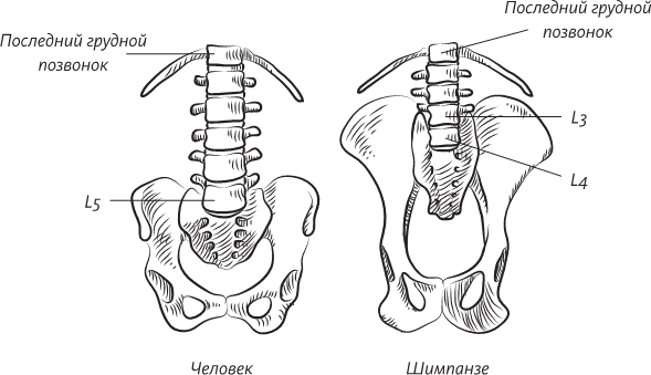 Поясничный отдел позвоночника человека состоит из пяти позвонков, а аналогичный отдел позвоночника шимпанзе – из четырех. Нижние поясничные позвонки шимпанзе зажаты между высокими подвздошными костями – частями тазовых костей