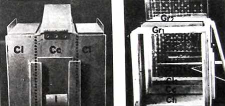 В исследованиях внутрисемейных отношений в гнезде ос-веспа Монтанье использовал двух- и трехсекционные клеточки с перфорированными перегородками, потребовавшимися для сортировки насекомых по размеру. На снимках: внешний вид трехсекционяых клеточек, собранных и открытых.