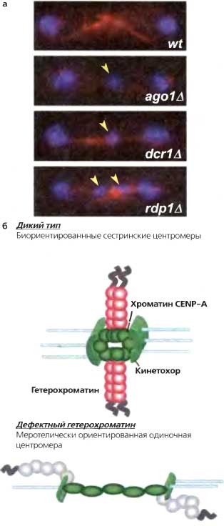 (а) Клетки, лишенные RNAi или компонентов гетерохроматина, обнаруживают увеличенную частоту хромосомных потерь и отстающих хромосом на веретенах в поздней анафазе, (б) Отстающие хромосомы в клетках с дефектным гетерохроматином могут быть результатом дезорганизации кинетохоров, так что одна центромера может прикрепляться к микротрубочкам от противоположных полюсов. Такая меротелическая ориентация могла бы сохраняться при переходе в анафазу; разрыв прикрепления к одному или другому полюсу приводил бы к случайной сегерегации, результатом чего были бы случаи потери-приобретения хромосом
