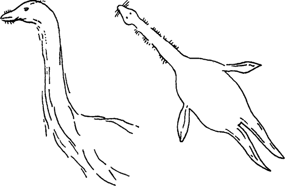 Перепуганные девчушки пустились наутек, иногда все-таки оборачиваясь назад; животное было уже в воде, и они видели теперь только его глаза, чуть выставленные над поверхностью воды. На следующий день учитель рисования сделал по рассказу девочек рисунок — все увидели, пожалуй, самого удивительного зверя на свете.