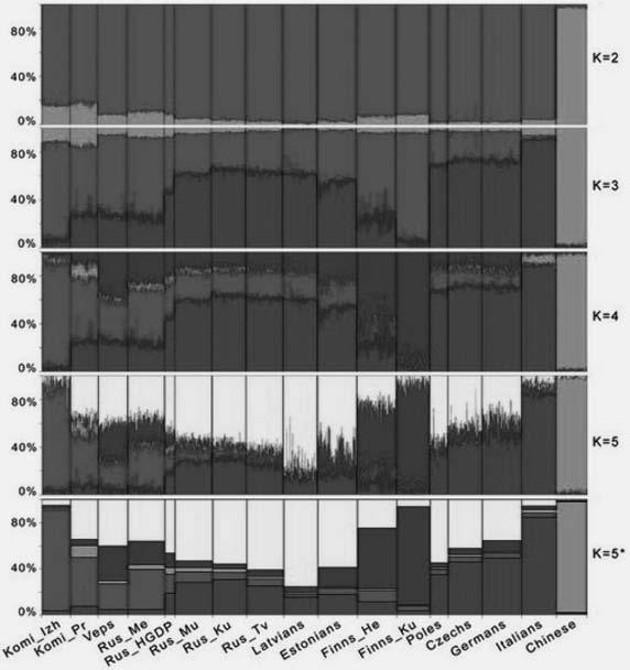 Теперь красная полоса. Для нее остается только два варианта – гаплогруппа I (без разрешения на I1 и I2), или уральская, угорская гаплогруппа N1b. Действительно, у итальянцев первой всего 1–3% и вовсе нет второй, что и показывает диаграмма. У остальных – на уровне единиц процентов, как и видно из диаграммы. По данным диаграммы этой гаплогруппы, особенно N1b, должно быть много у тестированных северных народностей. Действительно, в Красноборске Архангельской области гаплогруппы I 22 %, в Вологде – 20 %, и гаплогруппы N1b 3.3 %. Судя по диаграмме, у тестированных прилужских коми ее должно быть примерно 40 %, но в одной из статей 2009 года гаплогруппы N1b у них всего 15 %, но 50 % гаплогруппы N1c1. У ижемских коми ее должно быть, по диаграмме, почти 100 %, но опять же, думаю, что не определяли.