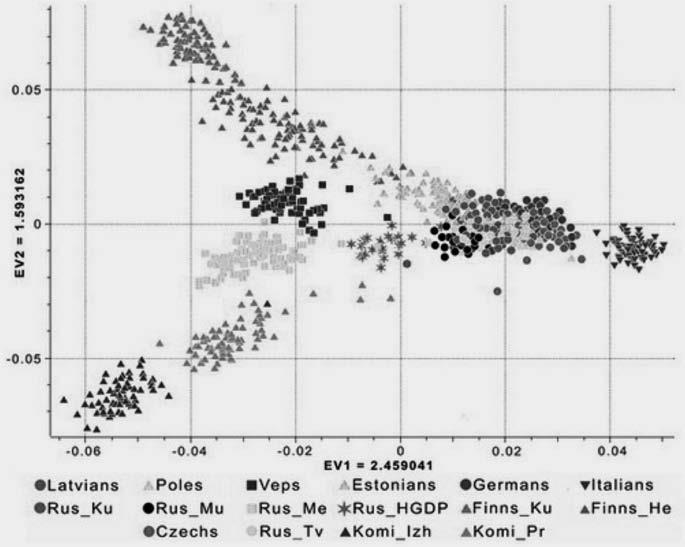 Мы видим, что популяции с близким набором мужских гаплогрупп, в которых доминирует (или значителен по представительству) R1a, образуют один кластер. Это – русские Курской, Владимирской, Тверской областей, латыши, немцы, чехи. Там же – эстонцы, которые начинают вытягиваться в сторону финнов (что неудивительно, у эстонцев – треть гаплогруппы N1c1), а именно в направлении финнов Хельсинки, и далее полоса уходит к финнам северной провинции, у которых должен быть максимум N1c1. То есть этот трек диаграммы, в левую сторону вверх, совершенно понятен. Как понятен и хвост этого трека – там крайний справа одинокий кластер итальянцев с максимальным содержанием гаплогруппы R1b. Других таких в рассматриваемых популяциях нет. Были бы ирландцы или баски – попали бы в компанию с англичанами. Вот пусть попгенетики это и проверят.