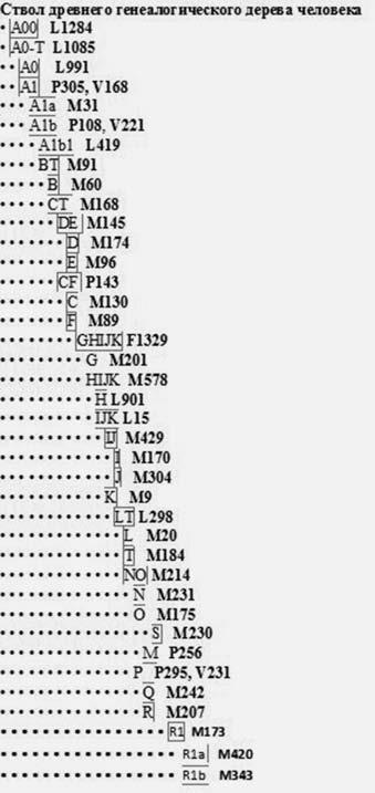 Гаплогруппы не просто соответствуют своим родам, но образуют определённую последовательность, лестницу гаплогрупп[44]показывающих их иерархию – последовательный, ступенчатый переход от точки расхождения африканских и неафриканских популяций (примерно 160 тыс. лет назад) до самой недавней гаплогруппы R, образовавшейся примерно 30 тыс. лет назад. Эта лестница называется филогенетическим деревом гаплогрупп и их снипов. Все гаплогруппы и субклады на дереве должны включать снипы «вышестоящих» гаплогрупп и субкладов. То есть принцип «лесенки» должен выполняться. Преемственность узловых родов человечества должна соблюдаться.