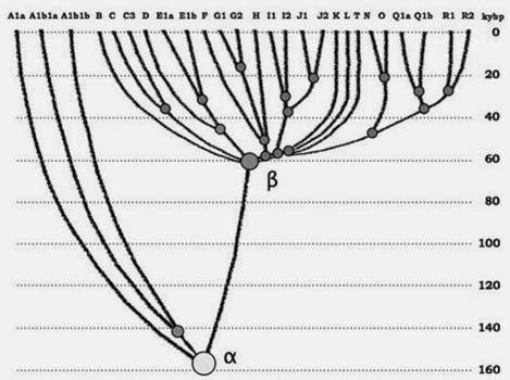 Рис. 6а. Диаграмма эволюции гаплогрупп современного человечества. На горизонтальной оси – основные гаплогруппы Y-хромосомы человечества, на вертикальной – абсолютная шкала времени. Общий предок альфа-гаплогруппы жил примерно 160 тысяч лет назад, общий предок бета-гаплогруппы (или гаплогрупп от В до Т) – 64±6 тысяч лет назад(из статьи[45]).