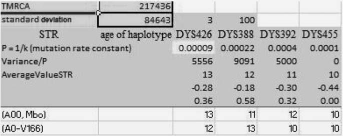 Мы видим, что при таком разрешении большая часть аллелей (это – числа в гаплотипах) у R1a и R1b одинаковы (совпадают 16 аллелей из 22). Между гаплотипами А00 и R1b – 24 мутации, что снижает возраст общего предка на семь тысяч лет, то есть на 3 %. Это – в пределах погрешности расчетов. Только не стоит строить пропорции, там счет нелинейный.