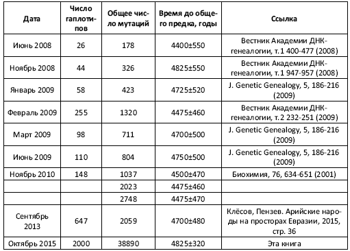 Вывод – доля в процентах гаплогруппы в популяции сама по себе означает не очень много, это просто структура современной популяции, то, чем занимаются популяционные генетики. Как отмечалось выше, часто бывает, что доля большая, а общий предок недавний, просто потомки общего предка быстро размножились, условия были благоприятными. Еще пример – доля гаплогруппы R1a в высших кастах Индии достигает 72 %[35], а сама гаплогруппа пришла в Индию с ариями примерно 3500 лет назад. Хотя в самой цитируемой работе по той же порочной «логике» попгенетиков утверждалось, что раз доля гаплогруппы R1a в Индии (то есть в высших кастах) столь высока, то R1a в Индии и образовалась. На что можно с иронией сказать, что поскольку в нашей фамильной деревне Клёсово в Курской области доля гаплогруппы R1a составляет 100 %, то гаплогруппа в той деревне и образовалась.