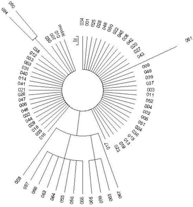 Это – два идентичных гаплотипа, на дереве выше под номерами 054 и 060. С правой стороны – гаплотип 061, он имеет вид