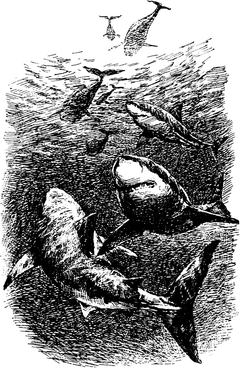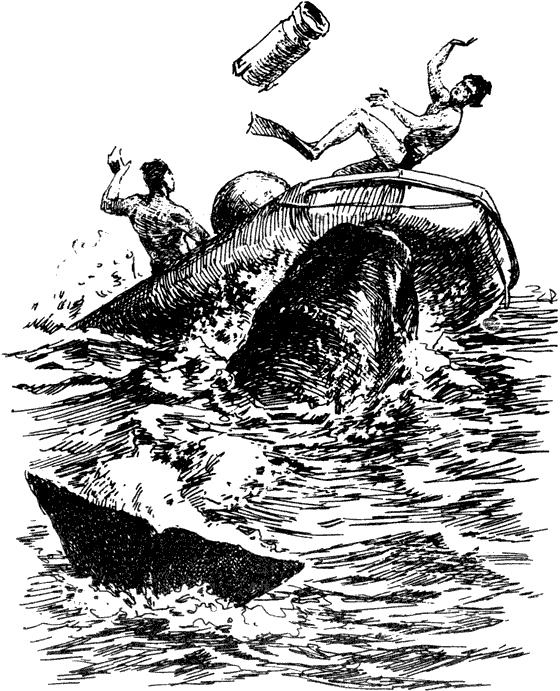 Подвесной мотор срывается и повисает в воде за кормой. Морис Леандри от толчка вылетает за борт, но, подхлестываемый страхом, живо возвращается на катер. Что же до юного кита, то он, прорвав кольцо, спокойно ныряет и исчезает, явно удовлетворенный успешным маневром.