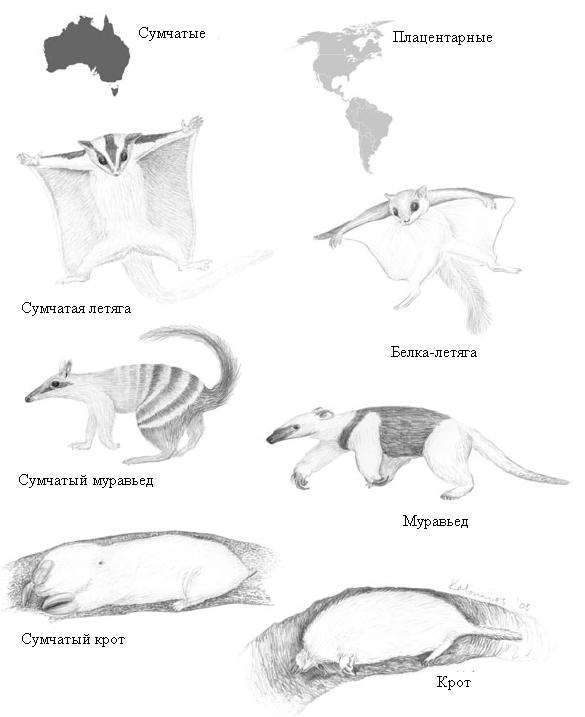 Параллельная эволюция на разобщенных массивах суши. Справа — американские плацентарные млекопитающие, слева — их австралийские сумчатые аналоги (Coyne, 2009). Внешне (т. е. по «поверхностным» адаптивным признакам) сумчатая летяга больше похожа на обычную летягу, чем на сумчатого крота или сумчатого муравьеда. Однако по более «глубоким» (т. е. эволюционно древним) анатомическим и эмбриологическим признакам, а также по нуклеотидным последовательностям ДНК, она гораздо ближе к другим австралийским сумчатым. Поэтому ее и относят к отряду сумчатых, а белку-летягу — к отряду грызунов.