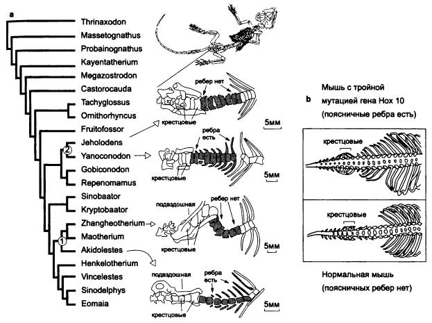 Параллельная эволюция признака «наличие/отсутствие поясничных ребер» у мезозойских млекопитающих.