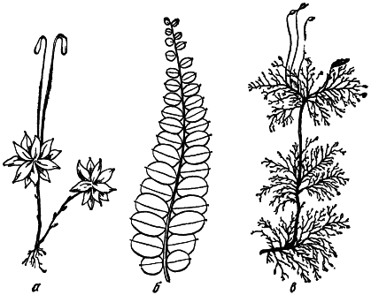 Рис. 24. Мхи родобриум (а), мниум (б) и хилокомиум (в)
