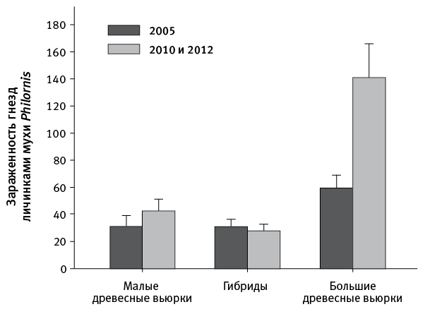 Птенцы крупных вьюрков страдают от паразита сильнее, чем птенцы мелких, — скорее всего, просто потому, что мухи предпочитают откладывать яйца в большие гнезда. В гнездах малых и гибридных древесных вьюрков меньше личинок паразитической мухи, чем в гнездах больших древесных вьюрков. В дождливые 2010 и 2012 годы число личинок по сравнению с засушливым 2005 годом выросло немного в гнездах малых вьюрков, резко (более чем вдвое) — в гнездах больших вьюрков и только для гибридов не изменилось, оставшись сравнительно низким (рис. 29.1). Возможно, это означает, что гибриды обладают повышенной устойчивостью к паразиту. В таком случае межвидовая гибридизация должна быть очень выгодна, особенно большим древесным вьюркам.