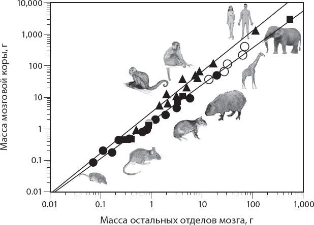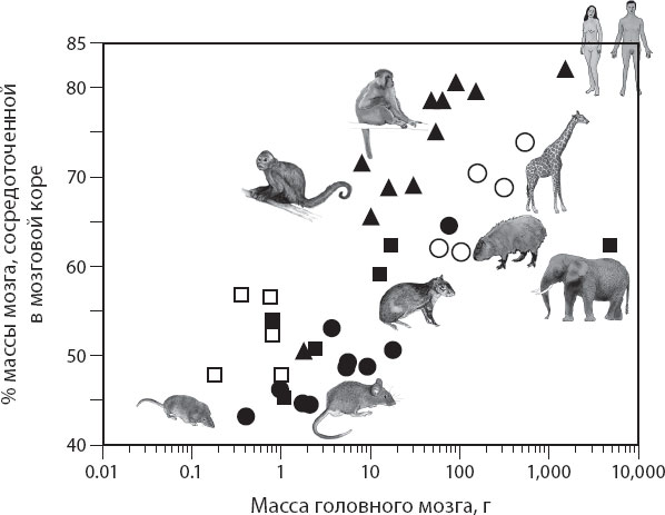 Увеличение массы коры в ходе эволюции млекопитающих, описываемое степенной функцией с показателем, намного большим единицы, было значительным как в абсолютном, так и относительном выражении в сравнении с массой остальных отделов мозга. Как показано на рис. 7.2, относительная масса мозговой коры, то есть процент массы мозга, содержащийся в коре, возрастает вместе с увеличением массы мозга во всех группах млекопитающих, но по-разному у приматов и неприматов; так, например, у антилопы доля мозговой коры составляет 72 %, а у бабуина – 80 %. Африканский слон, с его непомерно развитым мозжечком, выделяется на общем фоне: несмотря на то что мозг слона по общей массе в три раза превышает мозг человека, относительная доля в ней коры составляет всего 62 %, в то время как у человека этот показатель достигает 82 %.