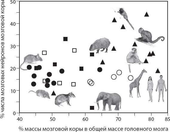 Рис. 7.3. Относительно большая по массе кора не содержит относительно наибольшего числа нейронов. Этот показатель широко варьирует, но у большинства видов кора мозга содержит 15–25 % всех мозговых нейронов независимо от ее относительной массы у насекомоядных (светлые квадратики), африканских зверей (черные квадратики), грызунов (черные кружки), парнокопытных (светлые кружки) и приматов (треугольники). Единственным исключением является африканский слон, кора которого содержит всего лишь 2 % всех нейронов головного мозга