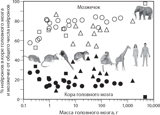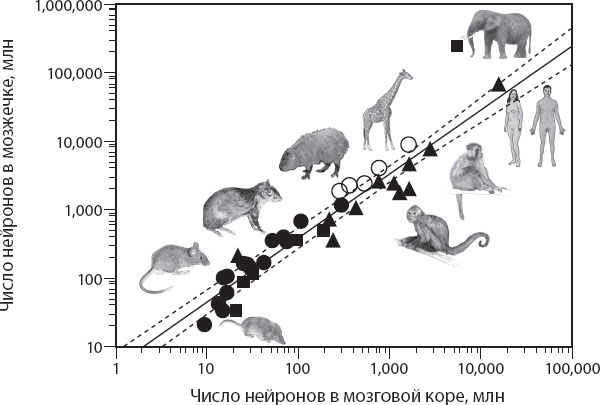 Согласованное линейное нарастание числа нейронов в коре головного мозга и в мозжечке большинства видов млекопитающих имеет фундаментальные функциональные следствия, а именно: эволюция заключалась отнюдь не в стремлении к установлению господства исключительно коры в функциональной активности головного мозга. Напротив, у всех видов, за исключением слона, кора и мозжечок работают в тандеме, так, чтобы любое повышение обрабатывающих способностей коры сопровождалось пропорциональным увеличением таковых способностей мозжечка[128]. Все это становится еще более очевидным в головном мозге человека: в его коре сконцентрировано наибольшее абсолютное число нейронов среди всех видов млекопитающих, но, несмотря на это, относительное число нейронов в коре такое же, как и у других млекопитающих, за исключением слона.