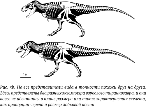 Даже в одном возрасте не все представители одного вида в точности похожи друг на друга (рис. 5b). Среди людей встречаются рослые и невысокие, шатены и брюнеты, у человека могут быть серые или зеленые глаза, или большие уши, или римский нос, но есть и более глубокие различия в скелете и зубах. Нередко попадаются люди с одной лишней или недостающей костью в копчике, с зубами мудрости или без, со вдавленной грудью, без ключиц, с другими вариациями. Некоторые из этих особенностей встречаются значительно реже других (хотя могут быть обычными для отдельных популяций), но все они – часть картины человеческой изменчивости. Лично у меня, например, довольно странная форма черепа, что хорошо видно при короткой стрижке, но я искренне надеюсь, что меня из-за этого не станут исключать из человеческого вида. Нам, разумеется, необходимо принимать во внимание такие различия внутри вида (известные как внутривидовая изменчивость) и не придираться к мелочам: только потому, что у найденного вами черепа на один зуб больше, чем у всех остальных экземпляров Tyrannosaurus rex, нельзя считать, будто перед вами новый вид.