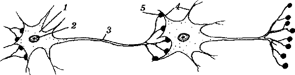 Строение нейрона: 1 — тело клетки: 2 — ядро; 3 — длинный отросток (аксон); 4 — короткие отростки (дендриты); 5 — синапсы (контакты с соседними клетками)