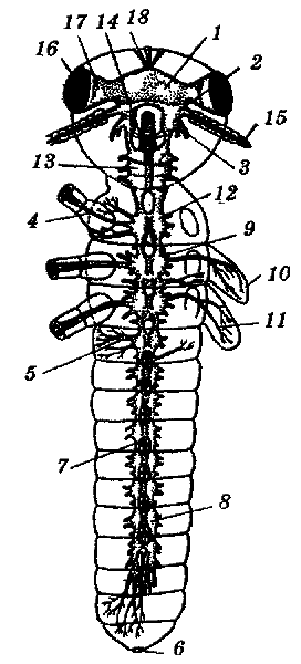 Центральная нервная система насекомого: 1 — протоцеребрум; 2 — дейтоцеребрум; 3 — тритоцеребрум; 4 — нерв ноги; 5 — сегментарные нервы брюшка; 6 — анус; 7 — непарный нерв симпатической системы; 8 — брюшной ганглий; 9 — ганглий среднегруди; 10 — крыло; 11 — нерв крыла; 12 — ганглий переднегруди; 13 — подглоточный ганглий; 14 — тритоцеребральная комиссура; 15 — усик; 16 — глаз; 17 — оптическая область мозга; 18 — глазок